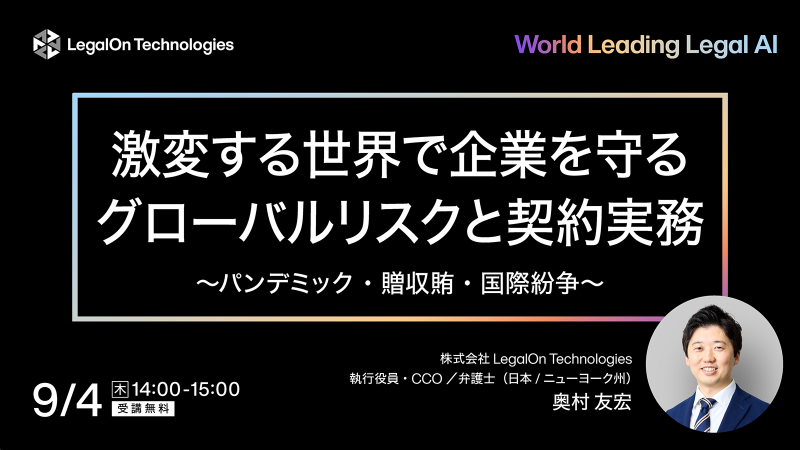 9/4(木)14時~「激変する世界で企業を守る グローバルリスクに対応する契約実務 ~パンデミック・贈収賄・国際紛争~」