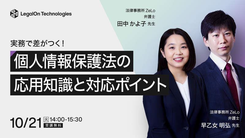 講師を務めるのは、データ保護・利活用やリスクコンプライアンス体制の整備・運営について、多数の実務経験を有する法律事務所 ZeLo の弁護士 田中かよ子先生と早乙女明弘先生です。