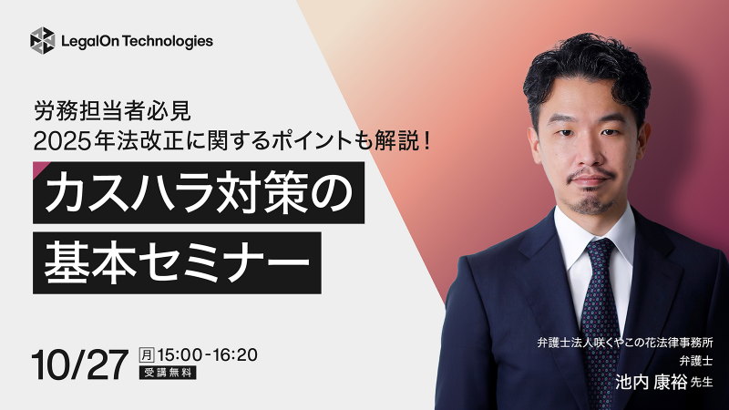 講師を務めるのは、「カスハラ問題の法的対応策」(ビジネス法務2025年2月号)等を執筆し、カスハラ問題の解決に経験と知見を有する、弁護士法人咲くやこの花法律事務所の弁護士 池内 康裕先生です。